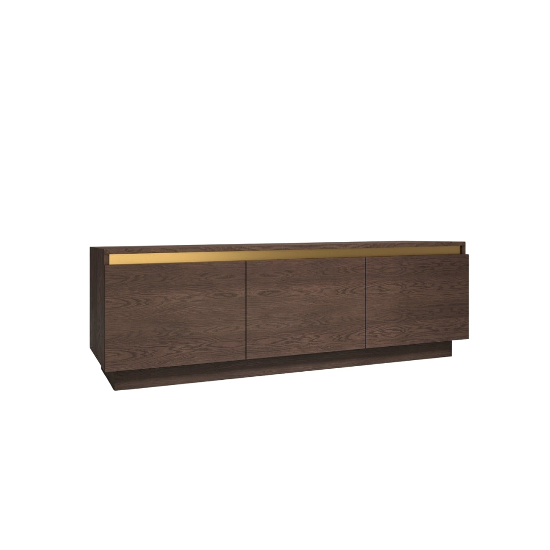 Available in rich brown or black oak veneer, the design is elevated with a bold gold stainless accent—adding a touch of luxury to its streamlined look. Perfect for contemporary living spaces, the Clover TV unit brings elegance and functionality together in perfect harmony.