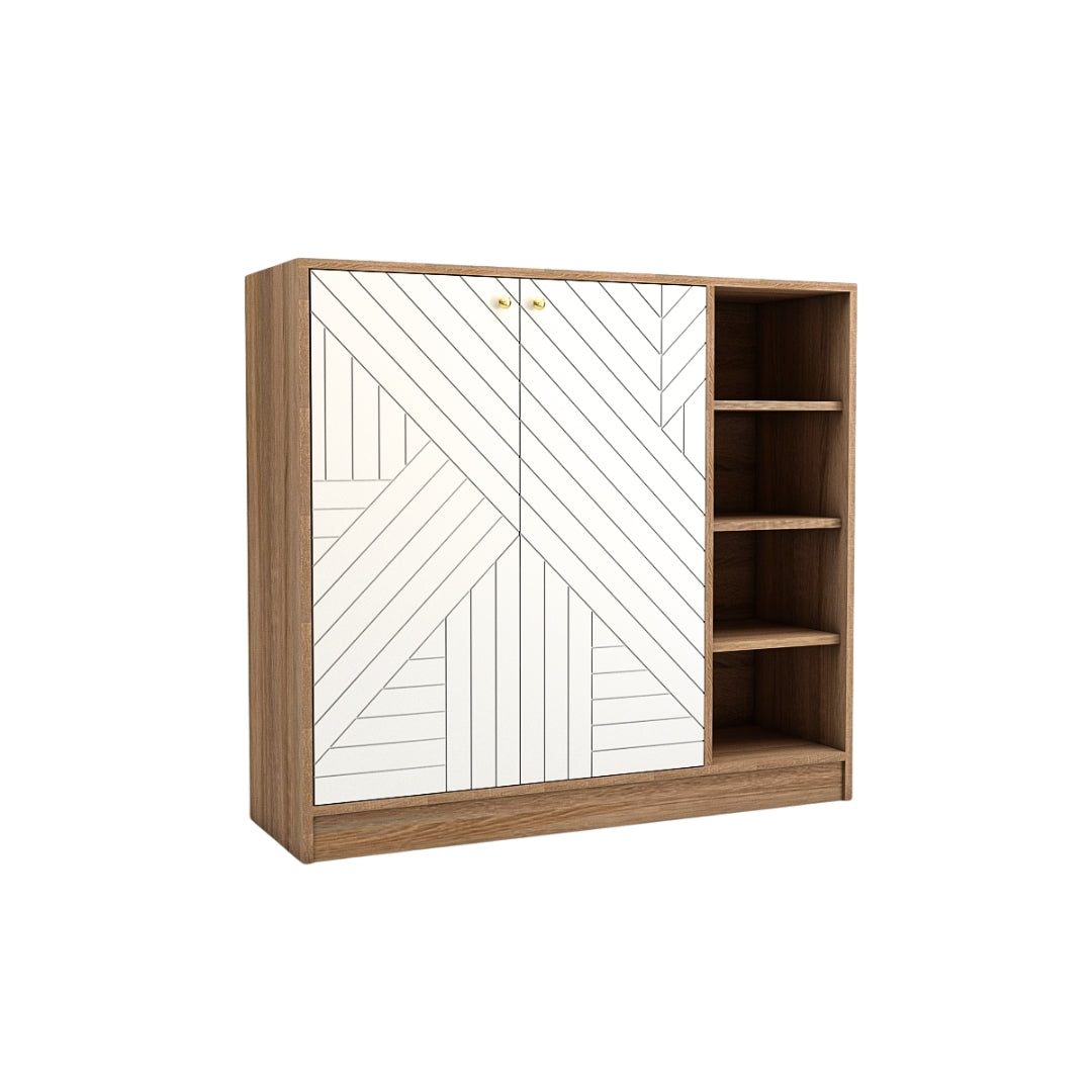 Elevate your entryway with our Layan Shoe Cabinet. With its 110cm width, it offers ample storage for all your footwear. The open shelves and gold button handles add a touch of sophistication, while the inside ventilation keeps your shoes fresh. A stylish and practical addition to your home.